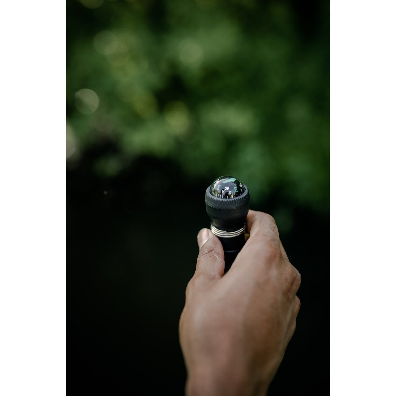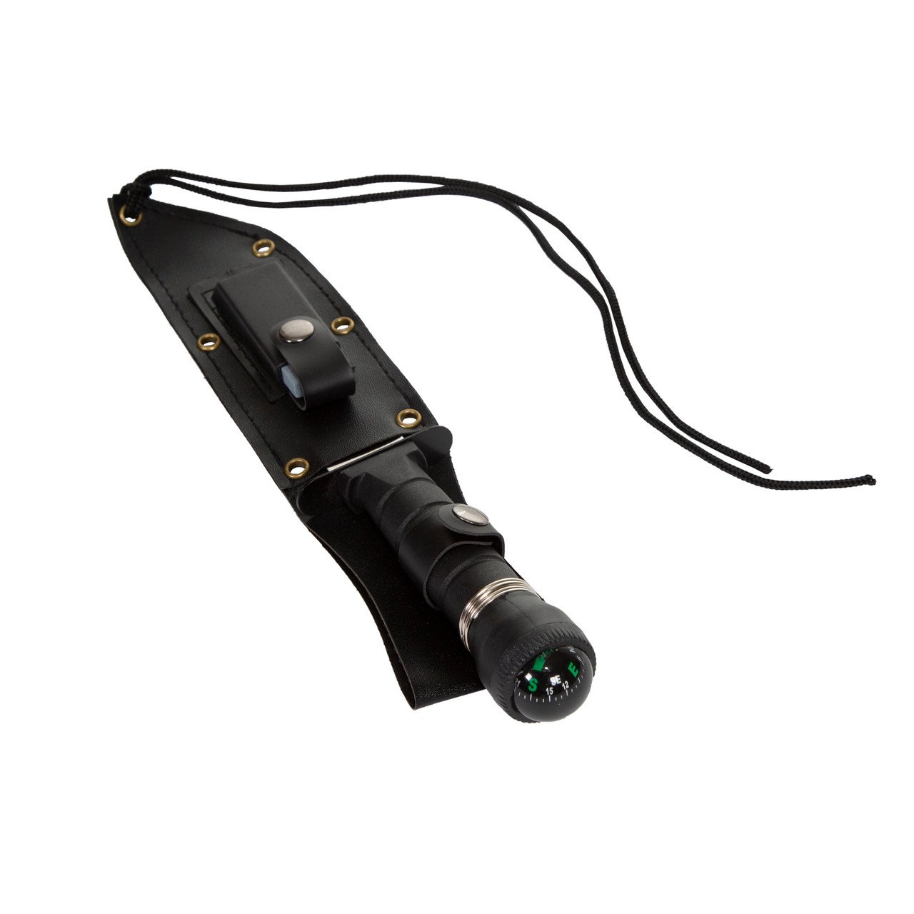 Six inch polished steel saw teeth blade. Bottle opener on back edge. Can be used as a signal mirror. High impact ABS hollow handle contains the following essentials: matches with striking pad, wire ring saw, fish hooks and leads, nylon line for fishing and needles. Watertight screw on cap with liquid filled compass. Sheath with sharpening stone. Belt loop and leg strap on sheath.